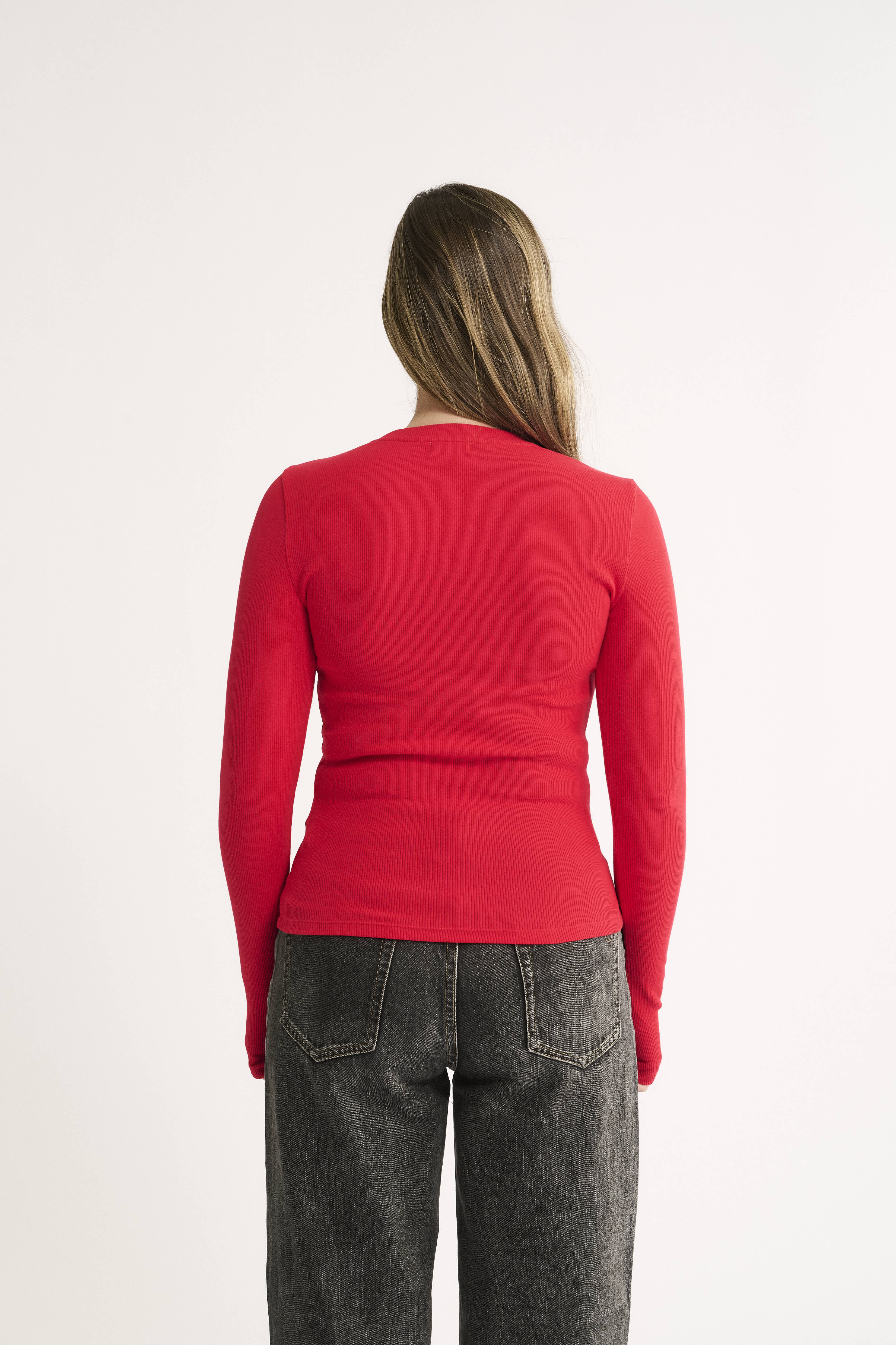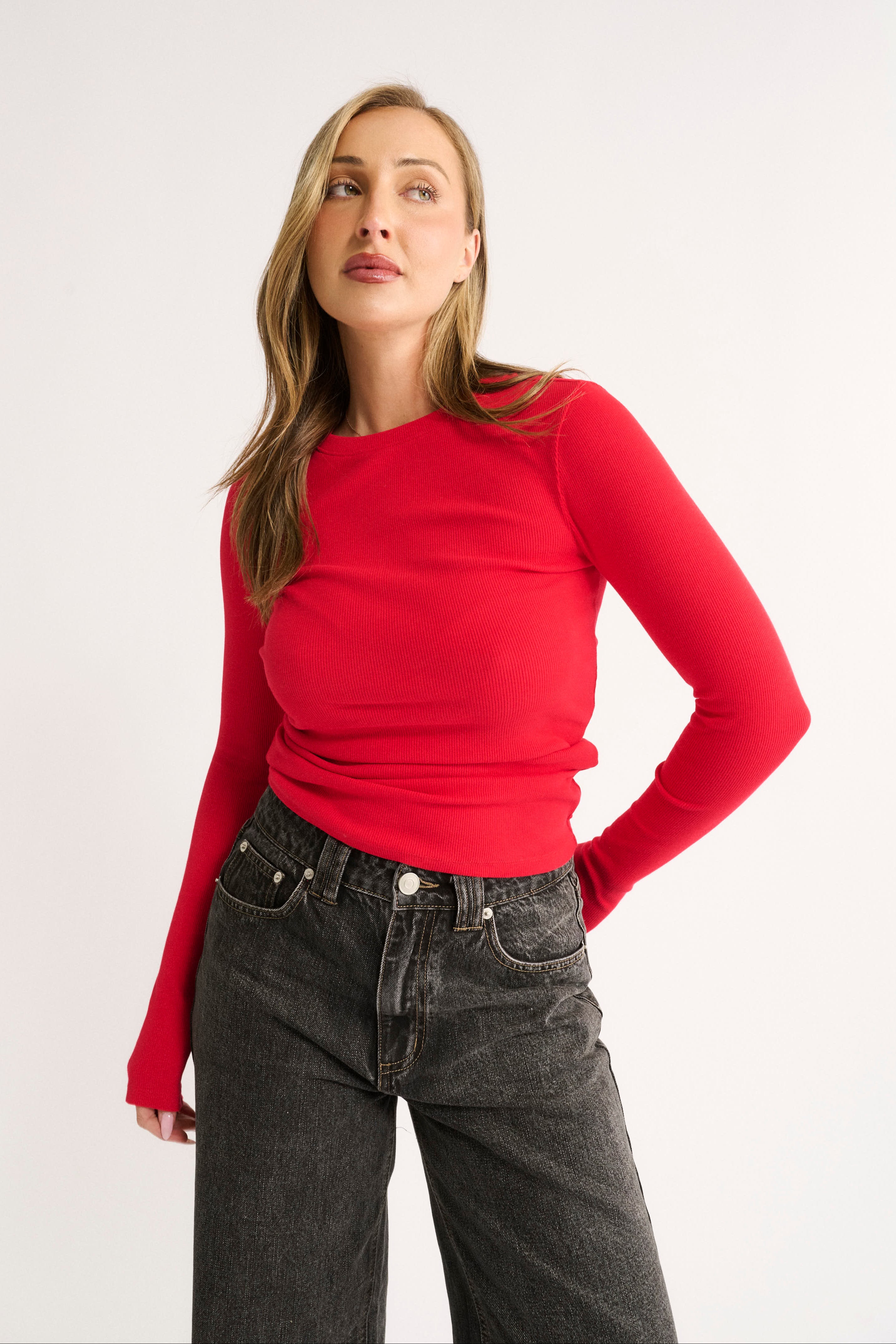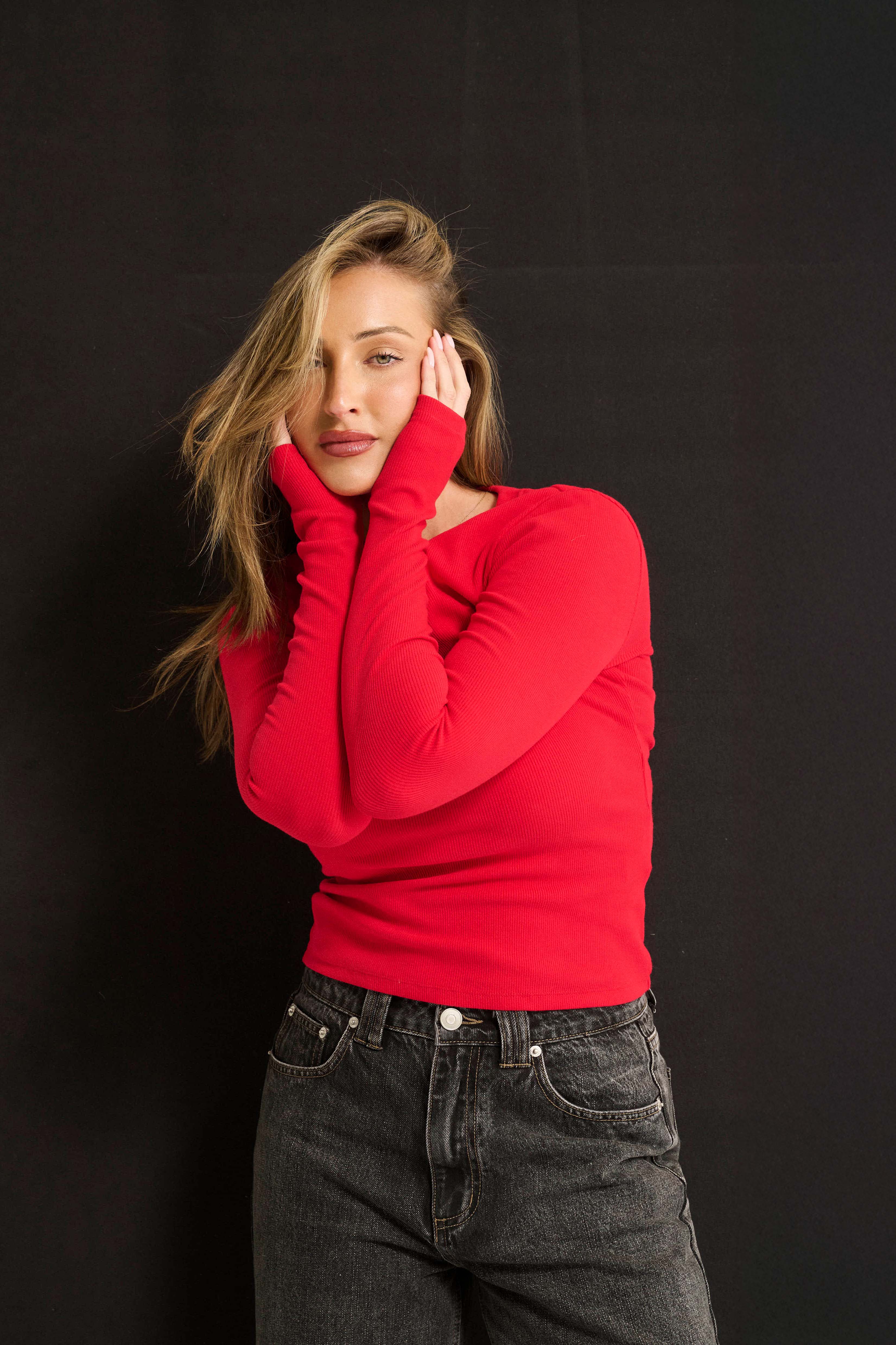 Add a pop of colour to your wardrobe with the Carina Classic Long Sleeve Top in Radiant Red, the colour of the season. This best-seller is crafted from our sellout signature rib fabric, known for its premium softness and stretch, offering a luxurious fit that moves with you. The slim fit silhouette is perfect for layering or wearing solo, making it a versatile addition to your basics collection.