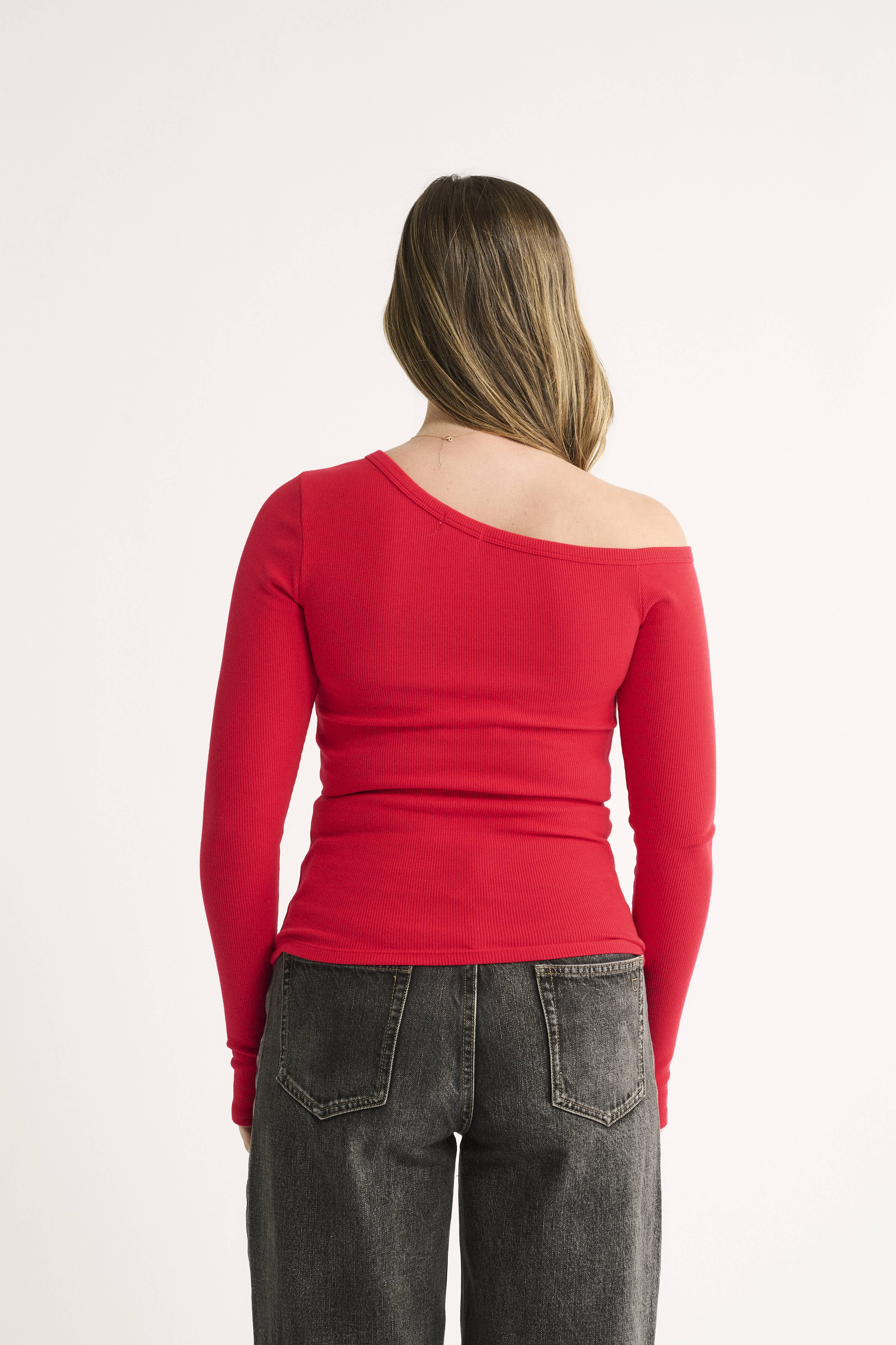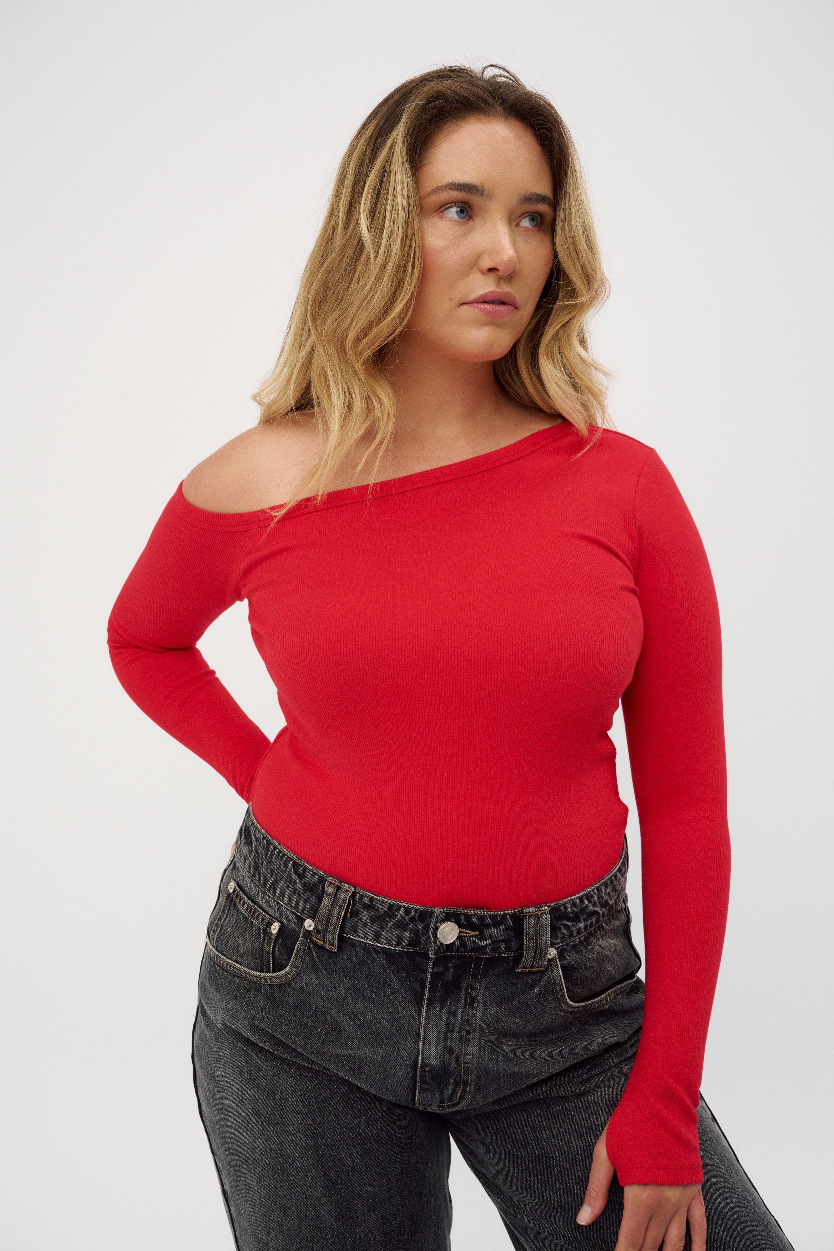 Designed with an off-the-shoulder neckline, long sleeves with thumbhole detail, and a slim, contouring silhouette, this top is effortless yet striking. The asymmetric ribbed neckline adds a modern touch, while the long sleeves make it perfect for layering -letting just the right pop of colour peek through under jackets and coats.