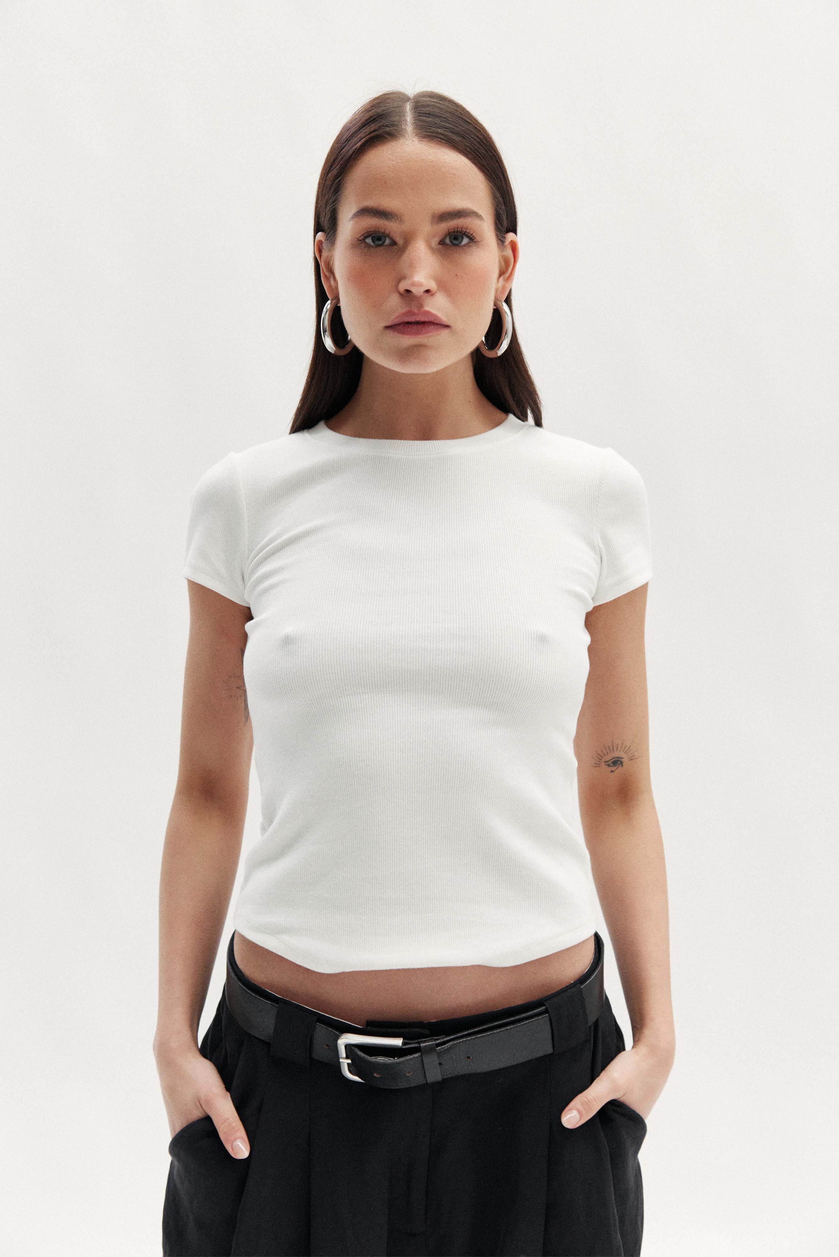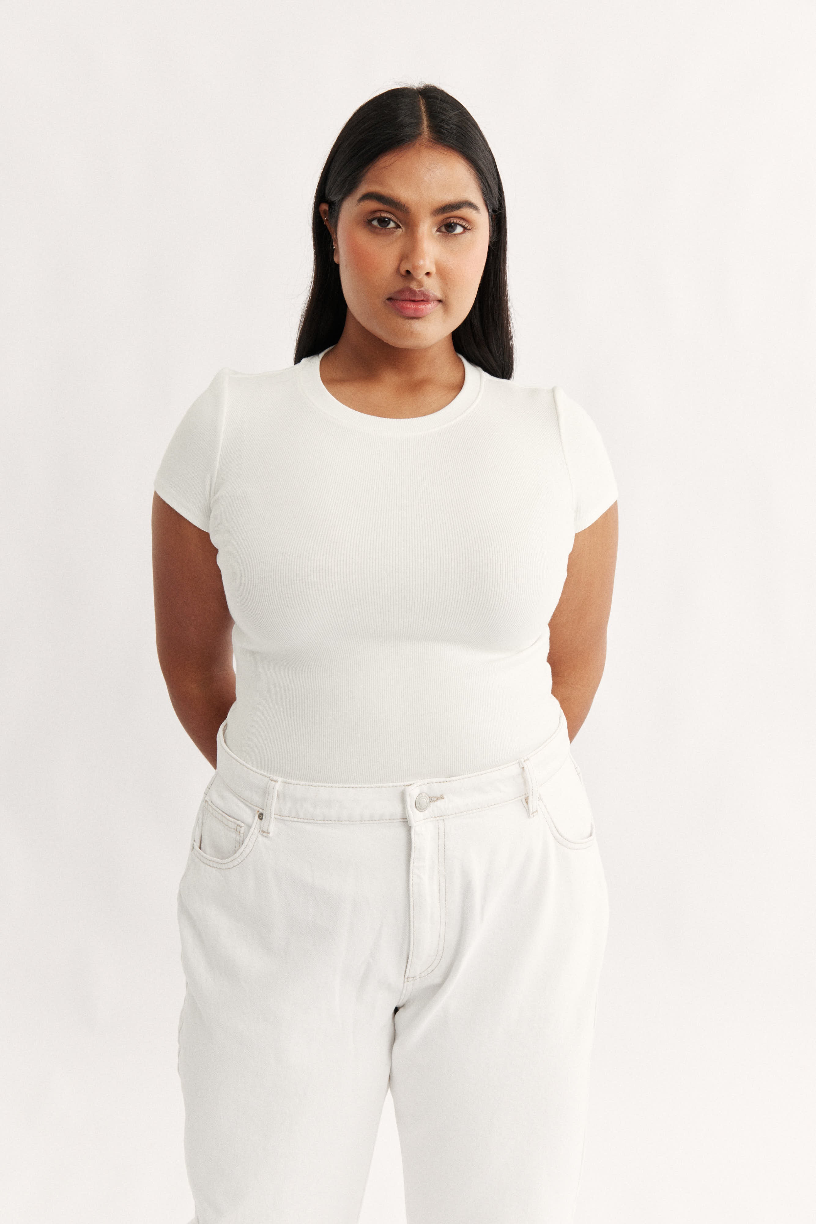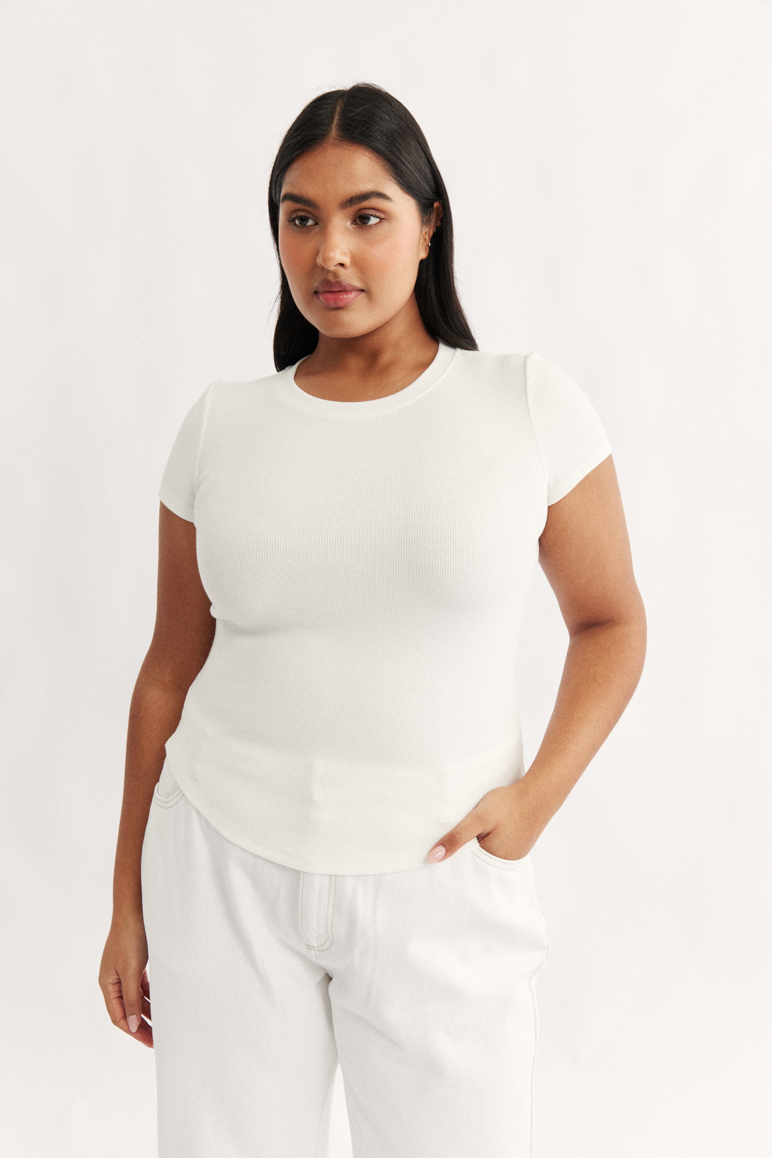 Transform your capsule wardrobe with the Clara Classic T-Shirt in Powder, a timeless staple that combines effortless style with modern comfort. Expertly crafted from our signature stretch cotton rib, this t-shirt features a classic crew neck and a slim-fit cut designed to contour and flatter your figure.