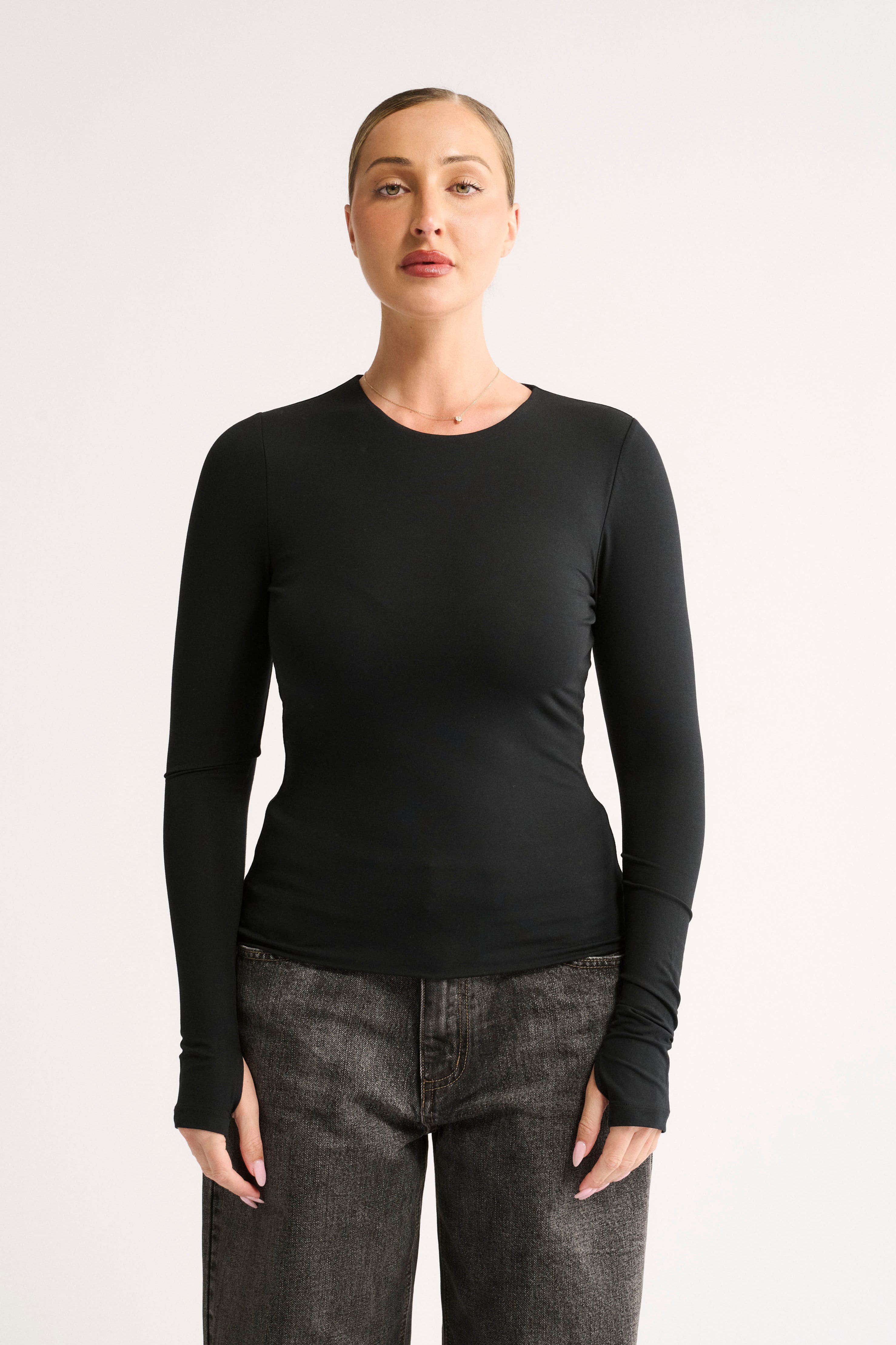 It features a classic crew neckline, full-length sleeves with subtle thumbholes, and a seamless hem for a clean, elevated look. Double-layered for light support and coverage, the Jenna Long Sleeve is cut long for versatile styling - tuck it in, wear it out, or ruche it at the waist.