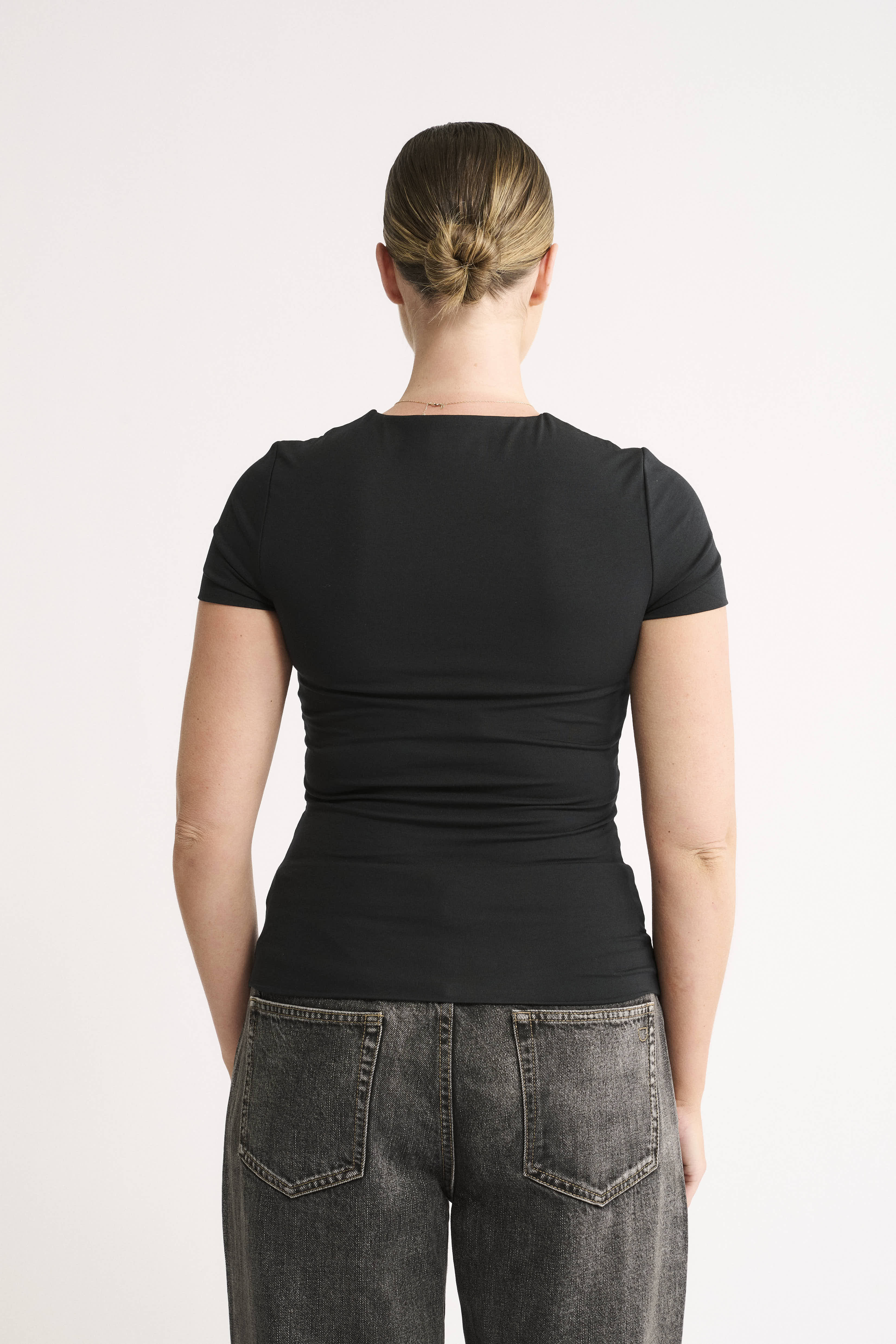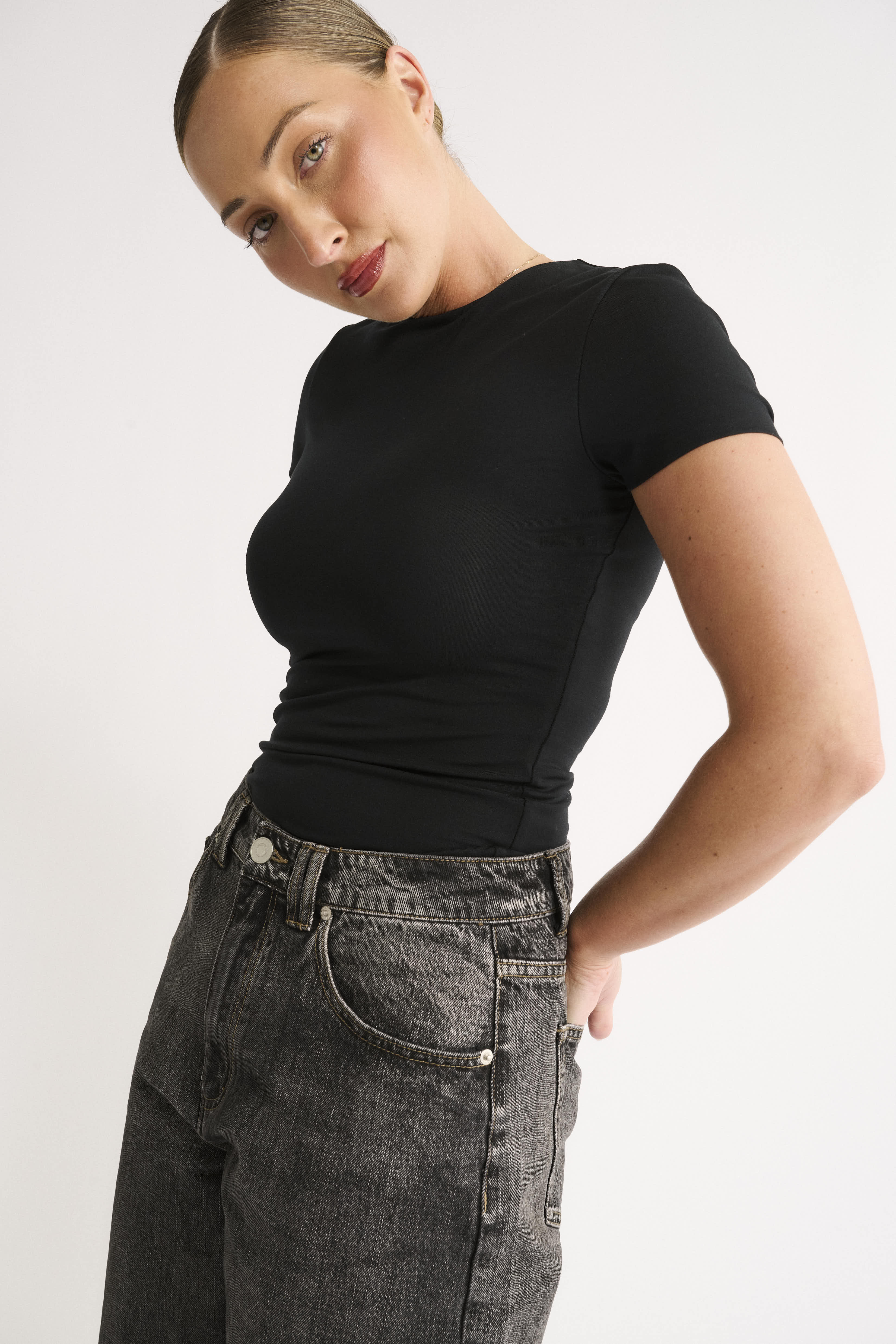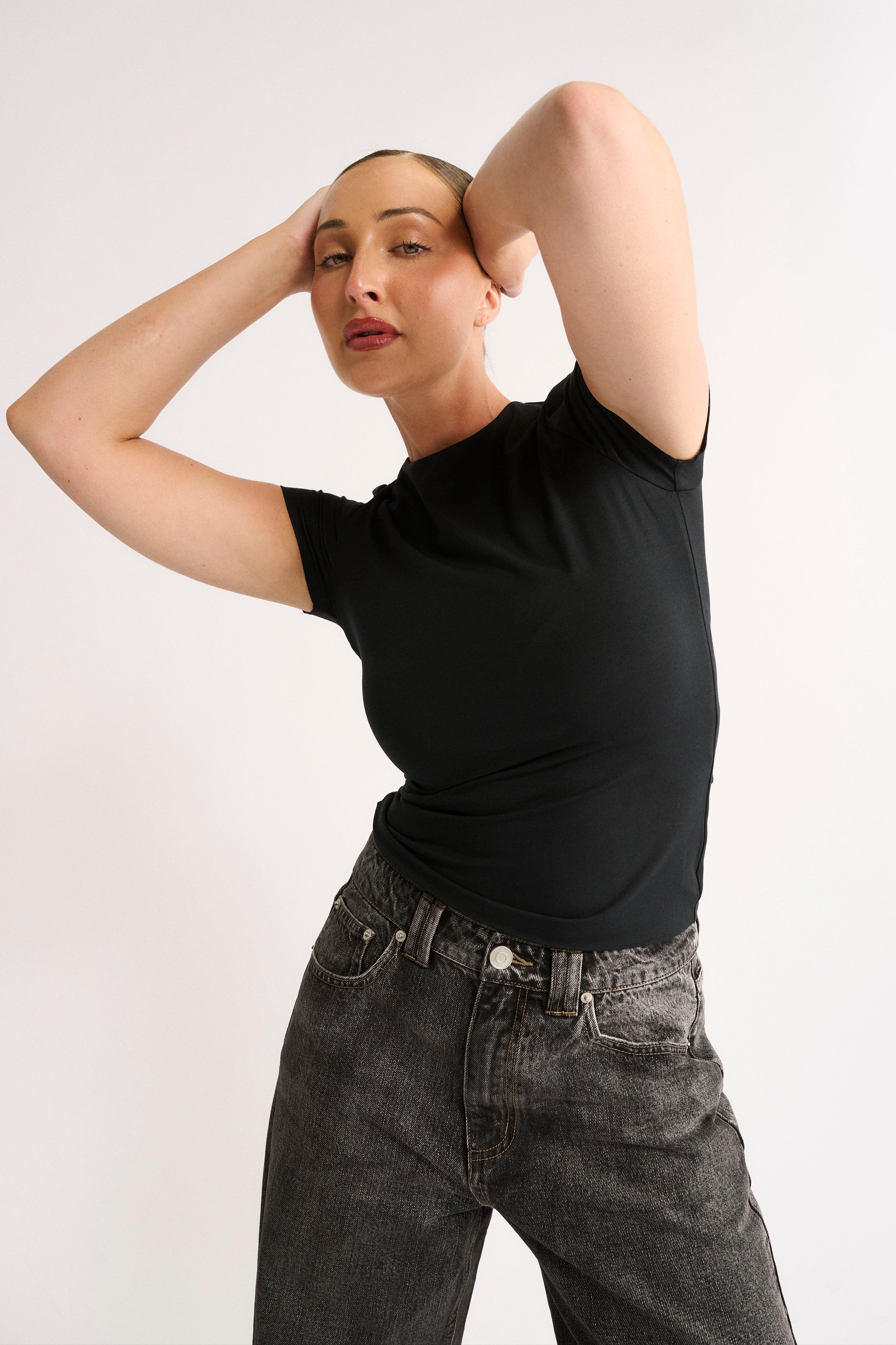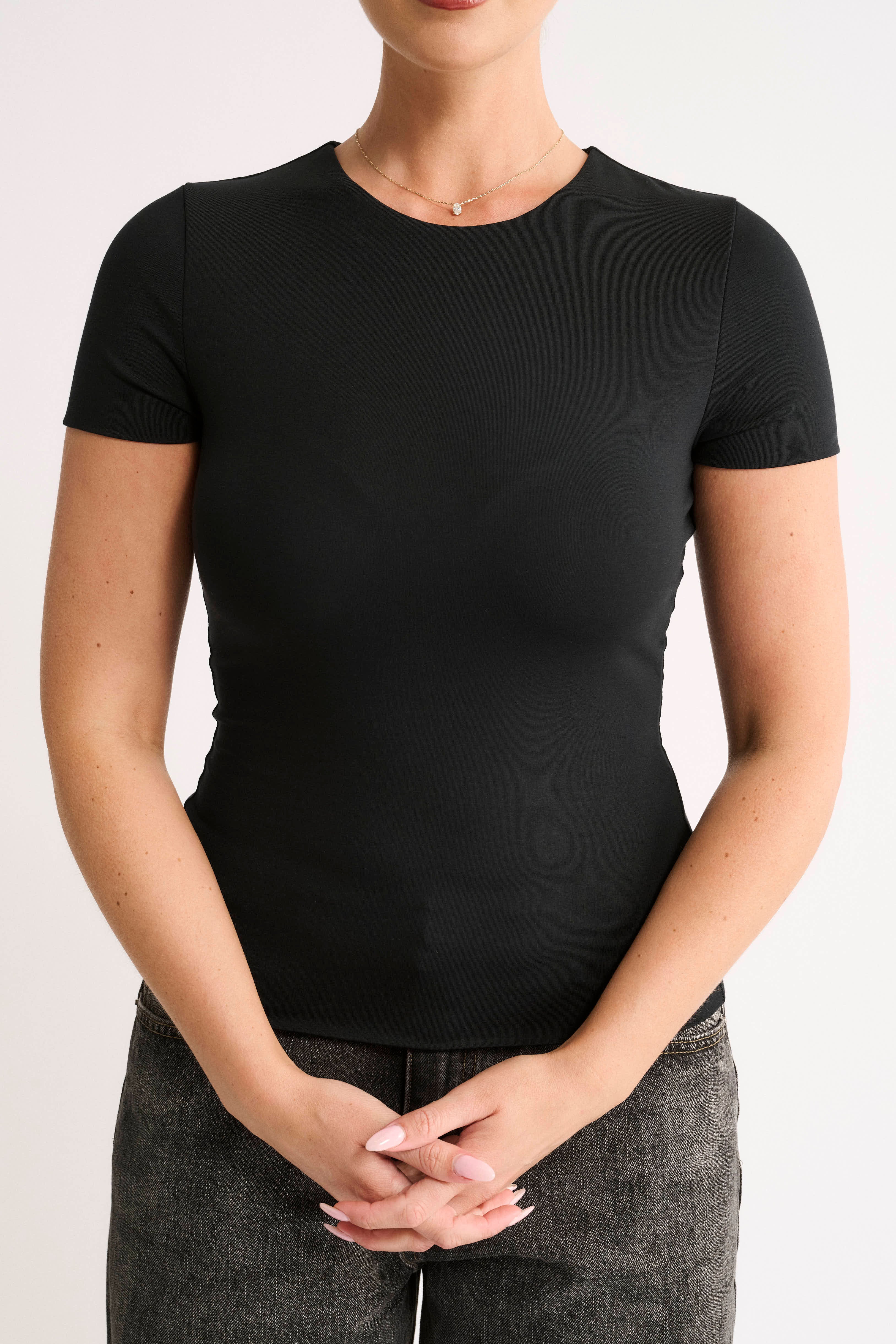 A refined staple made to elevate your everyday. The Jenna Crew Neck T-Shirt in Black is crafted from our premium Ultra Soft fabric, a breathable, body-contouring jersey with supportive stretch that moves with you, never against you. Double-layered through the body for a smoothing, held-in feel, it’s designed for comfort without compromise.