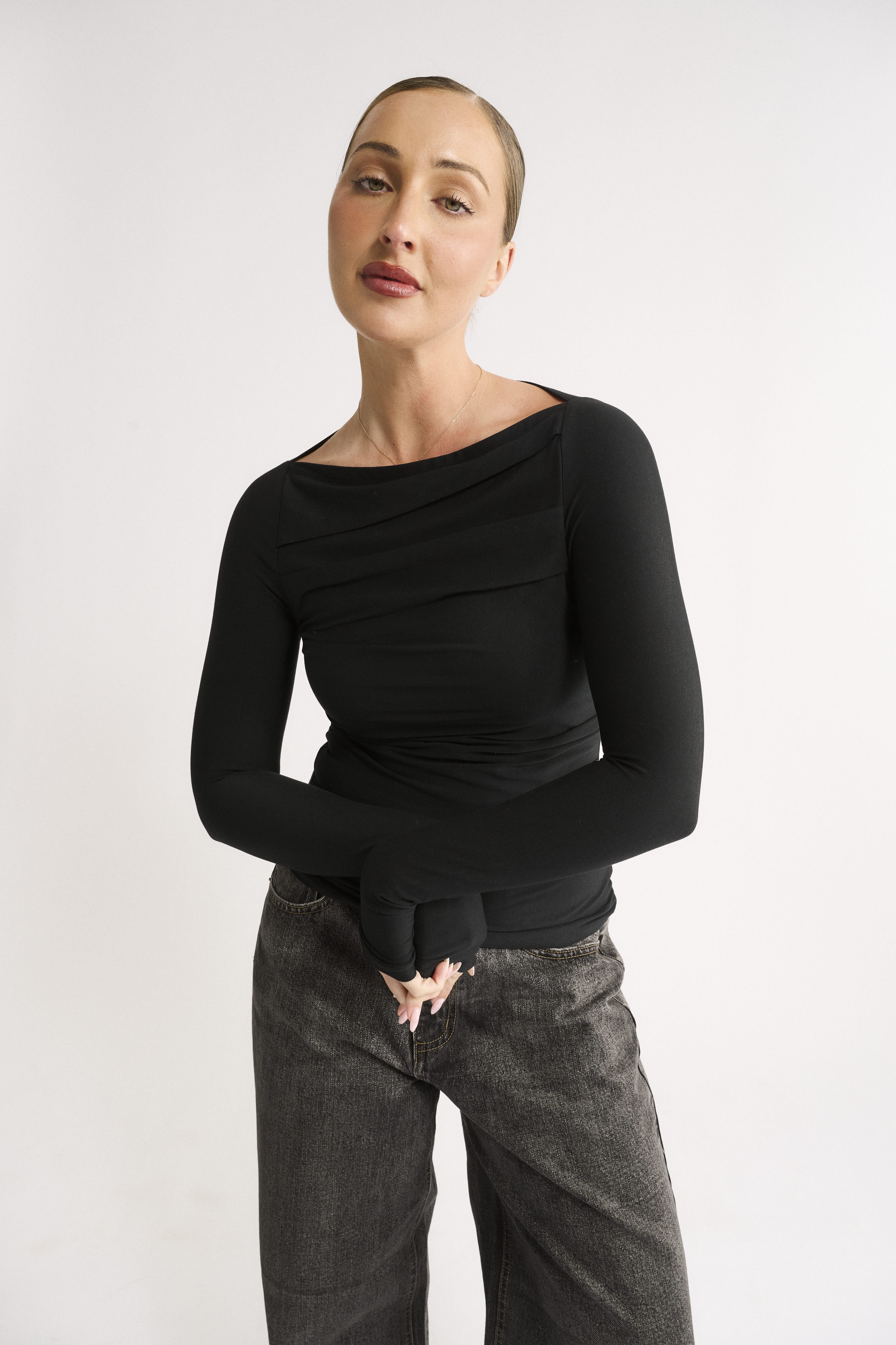 Defined by its boat neckline and gathered front detailing, the Margot is designed to shape a flattering, feminine silhouette. ease. In classic black, the Margot is endlessly versatile. A timeless essential you’ll return to again and again.